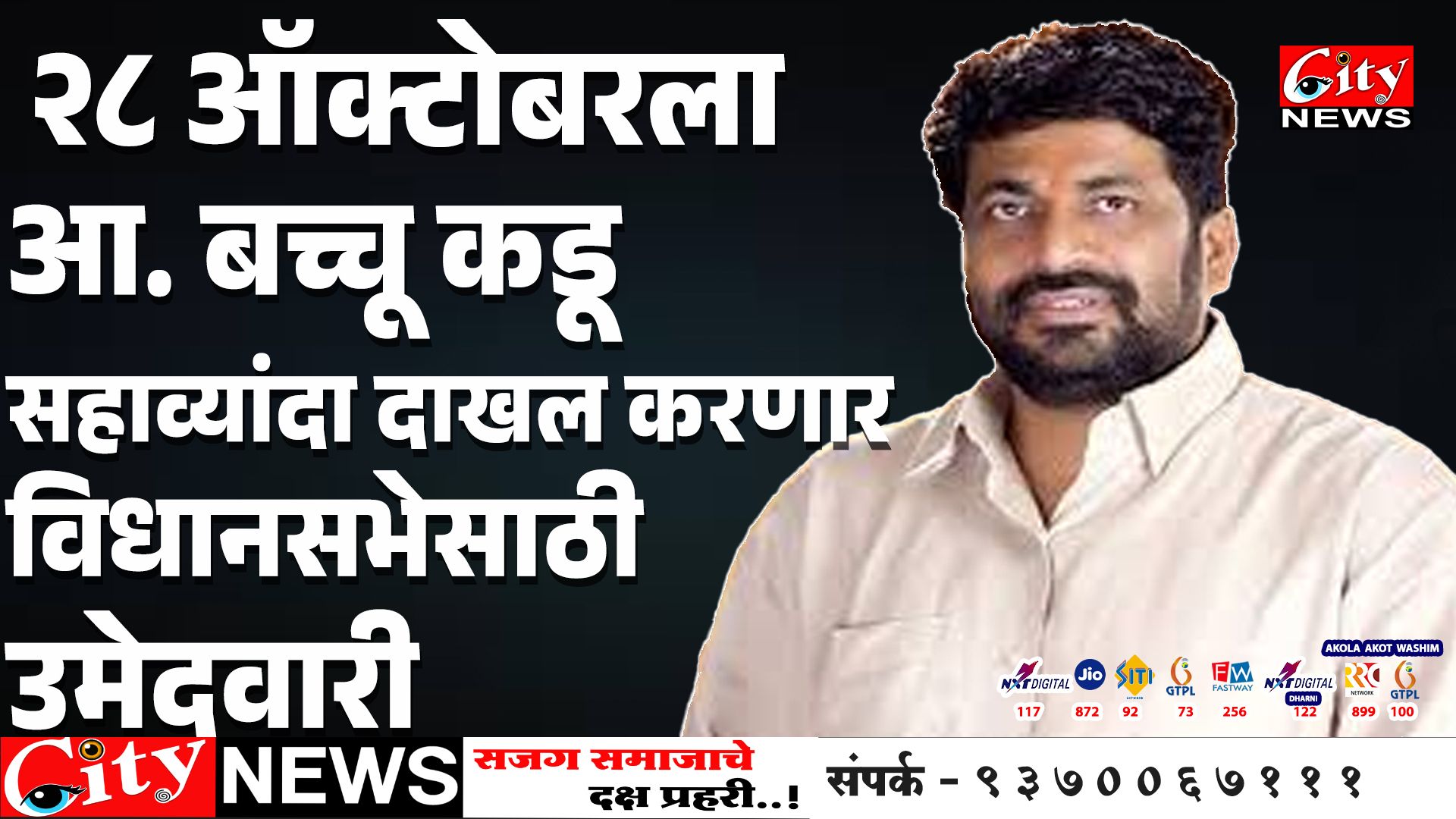 २८ ऑक्टोबरला आ. #बच्चू_कडू सहाव्यांदा दाखल करणार विधानसभेसाठी उमेदवारी चार वेळा निवडून दिल्याबद्दल आ. #बच्चू_कडूंनी मानले मतदारांचे आभार जाती धर्म पंथ विसरून आ. #कडू चालणार फक्त विकासाच्या वाटेवर २८ तारखेला कार्यकर्त्यांनी नामांकन दाखल करण्यासाठी येण्याचं केलं आवाहन.