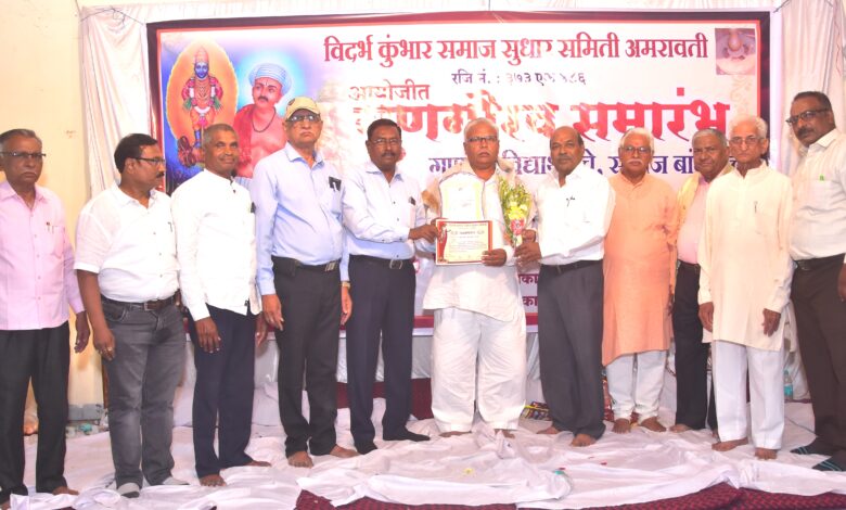 अमरावती : कुंभार समाजातील गुणवंत विद्यार्थी, खेळाडू, राजकीय प्रतिनिधी, व्यवसायी, उद्योजक इ.गुणवान व्यक्तींना समाज गौरव, समाज भूषण पुरस्काराने स्मृतिचिन्ह, सन्मान चिन्ह, प्रमाणपत्र,शाल श्रीफळ व पुष्पगुच्छ देऊन समाजातील मान्यवर व्यक्तींच्याहस्ते सत्कार करण्यात आला.