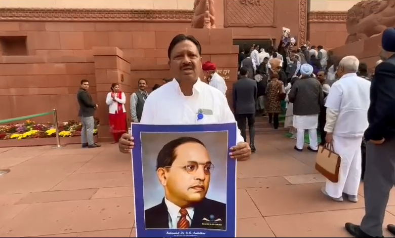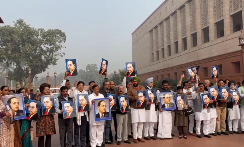 डॉ आंबेडकर विरोधात वक्तव्य केल्याने संसद भवन परिसरात विरोधी पक्षाने केले आंदोलन