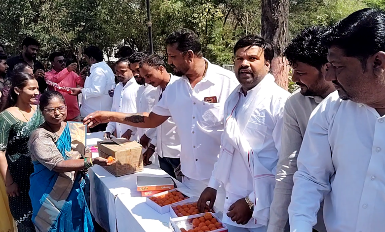 शिवजयंतीनिमित्त प्रहार पक्षाच्यावतीने जिजाऊ स्मारकाजवळ लाडू वाटप