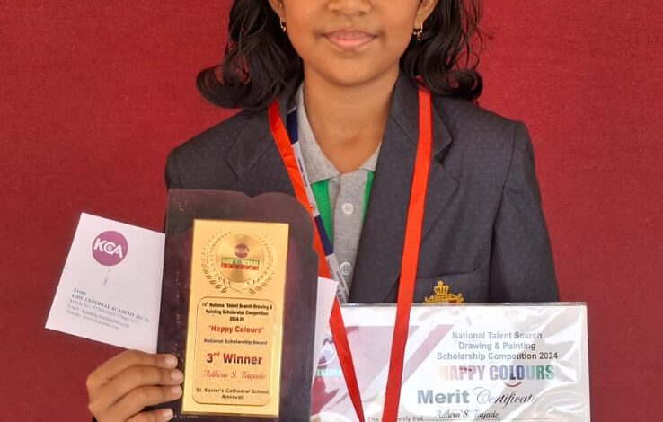 अमरावती :- विद्यार्थ्यामधील अंगीभूत अभिक्षमता व त्यांच्यातील प्रतिभेचा शोध घेऊन त्यांना प्रोत्साहित करण्याच्या उद्देशाने दरवर्षी राष्ट्रीय प्रतिभा शोध स्पर्धेचे आयोजन करण्यात येते. प्रतिभावान विद्यार्थ्यांची ओळख पटविण्यासाठी राष्ट्रीय स्तरावरच्या या स्पर्धेत हजारो विद्यार्थी सहभागी होत असून प्रावीण्याप्रत विद्यार्थ्यांना शिष्यवृत्ती प्रदान करण्यात येते. यावर्षीच्या १४ व्या नॅशनल टॅलेंट सर्च ड्रॉईंग अँड पेंटींग कॉम्पिटिशन २०२४-२५ मध्ये अमरावतीच्या कु. अधिरा सुयोग तायडे हिने सहभागी होऊन चित्रकला व रंगभरण स्पर्धेत देशातून तृतीय क्रमांक पटकाविला आहे. यासाठी अधिरा ला मेडल,प्रशस्तीपत्र व गौरवचिन्ह देऊन सन्मानित करण्यात आले. कु.अधिरा सुयोग तायडे ही सेंट झेवियर्स कॅथ्रेडियल स्कूल अमरावती मधील वर्ग ४ थी ची विद्यार्थिनी असून तिचे स्पर्धेत चित्रकला व रंगभरण च्या माध्यमातून आपल्या प्रतिभेचं दर्शन घडविले आहे. या बद्दल तिचे प्रिन्सिपल फादर रमशीन, सिस्टर रेबेका, वर्गशिक्षिका धनश्री मिस, चित्रकला शिक्षक रीनालिनी मिस, सोनाली सुयोग तायडे यांनी अभिनंदन केले आहे. कु.अधिरा तायडे हिला चित्रकलेची प्रचंड आवड असून तिने विविध शालेय स्तरावरच्या चित्रकला स्पर्धेत सहभागी होऊन अनेक आपल्या कल्पकतेतून विविध चित्रे रेखाटले आहे. आता तिने देशपातळीवरील स्पर्धेत सहभागी होऊन प्राविण्यप्राप्त केल्याने अधिरा तायडे हिचे सर्वत्र कौतुक होत आहे.