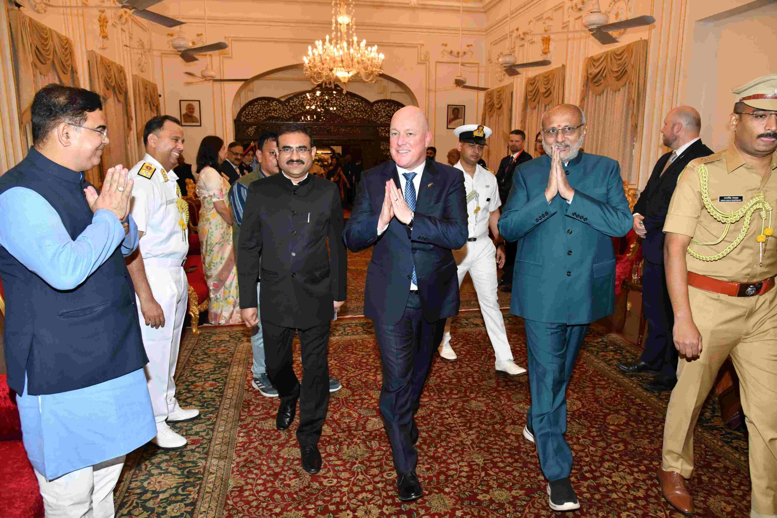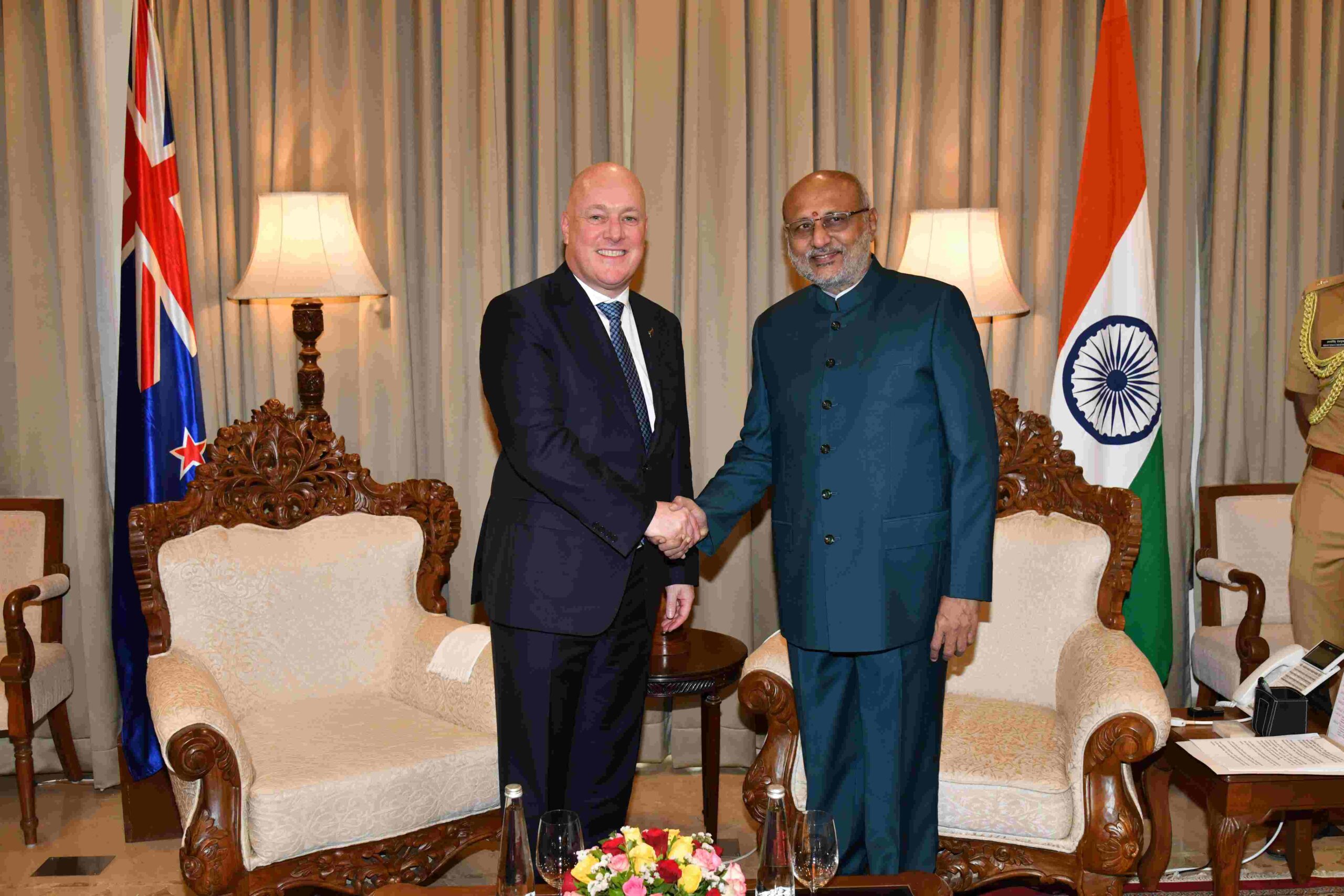 मुंबई :- राज्यपाल सी. पी. राधाकृष्णन यांनी न्यूझीलंडचे पंतप्रधान क्रिस्टॉफर लक्सन तसेच यांचेसह आलेल्या उच्चस्तरीय शिष्टमंडळाचे राज्याच्या वतीने राजभवन, मुंबई येथे स्वागत केले. यावेळी बैठकीत हरित ऊर्जा, क्रीडा, शिक्षण, कृषी तंत्रज्ञान, मत्स्यपालन, यांसह विविध विषयांवर चर्चा झाली.