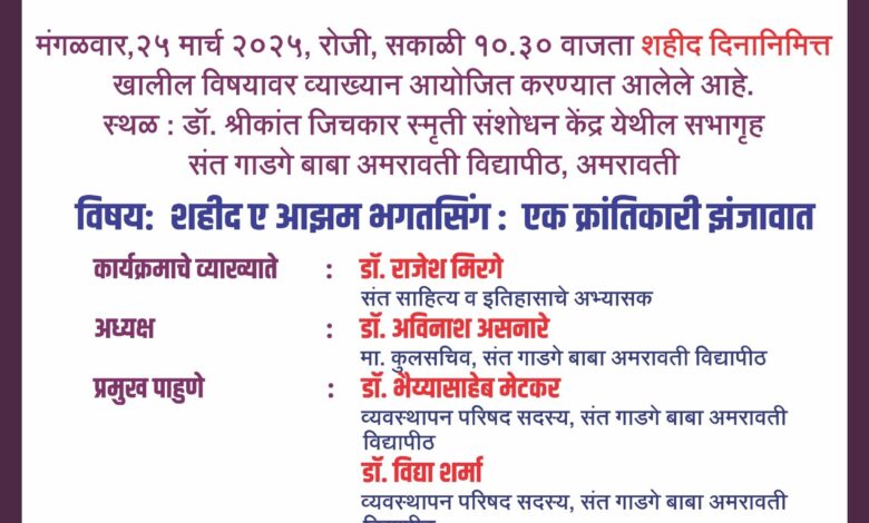 अमरावती :- संत गाडगे बाबा अमरावती विद्यापीठातील विद्यार्थी विकास विभागाद्वारे दि. 25 मार्च, 2025 रोजी सकाळी 10.30 वाजता डॉ. श्रीकांत जिचकार स्मृती संशोधन केंद्र सभागृहात शहीद दिनानिमित्त व्याख्यानाचे आयोजन करण्यात आले आहे.