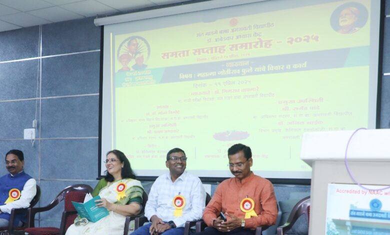 अमरावती – भारतीयांना स्वातंत्र्य, समता, बंधुत्व व न्याय मिळावे. देशात समता प्रस्थापित व्हावी, बहुजनांना शिक्षण मिळावे, स्त्रियांना सन्मान मिळावा, कष्टकरी व शेतकयांना न्याय मिळावा, यासाठी फुले दाम्प्त्यांनी आपले संपूर्ण आयुष्य खर्ची घातले. आपल्या देशात समता प्रस्थापित करणारे महात्मा फुले थोर समाजक्रांतीकारक आहेत, अशी मांडणी विद्यापीठाचे माजी परीक्षा व मूल्यमापन मंडळाचे संचालक डॉ. भिमराव वाघमारे यांनी केले. संत गाडगे बाबा अमरावती विद्यापीठात समता सप्ताह निमित्ताने महात्मा फुले स्मारक समिती, मुंबई यांचेकडून प्राप्त झालेल्या दाननिधीतून ‘महात्मा ज्योतिराव फुले यांचे विचार व कार्य’ या विषयावर व्याख्यान संपन्न झाले, त्याप्रसंगी प्रमुख व्याख्याते म्हणून ते बोलत होते. यावेळी व्यासपीठावर अध्यक्षस्थानी मानवविज्ञान विद्याशाखेच्या अधिष्ठाता डॉ. मोना चिमोटे, अधिसभा सदस्य श्री राजेंद्र पांडे, केमिकल टेक्नॉलॉजी विभागप्रमुख डॉ. अनिल नाईक, समाजशास्त्र विभागप्रमुख डॉ.के.बी. नायक, डॉ. किशोर राऊत व डॉ. आंबेडकर अभ्यास केंद्राचे समन्वयक डॉ. संतोष बनसोड उपस्थित होते.