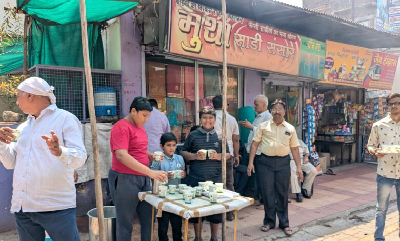यावर्षी सुद्धा उन्हाळा सुरू झाल्या बरोबर गेल्या महिनाभरापासून ताक वाटप दर रविवारी नियमिपणे सुरू आहे. ताक वाटपाच्या या कार्यक्रमात डॉ.गोविंदभाऊ कासट, ज्येष्ठ समाजसेवक सुदर्शनजी गांग, प्राचार्य डॉ.सुभाष गवई,डॉ. राजू डांगे, शाकीर नायक, विवेक सहस्त्रबुद्धे, उमेश वैद्य राजेंद्र पचगाडे, ईश्वर हेमने, दिलीप सदार अशा मित्रमंडळीच्या सुद्धा अनेकांचा दरवर्षी या ताक वाटपाच्या कार्यक्रमांमध्ये सहभाग असतो. नुकतेच या रविवारी डॉ.गोविंदभाऊ कासट, विवेक सहस्त्रबुद्धे व श्री हनुमान व्यायाम प्रसारक मंडळ संचालित, वीर वामनराव जोशी प्राथमिक शाळेचे मुख्याध्यापक दिलीप सदार व त्यांची दोन्ही मुले रिदम व रूहान यांनी या राजापेठ मित्र मंडळाच्या ताक वाटप कार्यक्रमाला हजेरी लावून येणाऱ्या- जाणाऱ्या सर्वांना बोलावून- बोलावून जिलेबी व ताक वाटप केला. रिदम( वय११ वर्ष )आणि रूहानला( वय ७ वर्षे) सुद्धा या कार्यक्रमात सहभागी होऊन खूप आनंद झाला. पुढच्या रविवारी सुद्धा आम्ही दोघे पुन्हा ताक वाटपाला येऊ अशी इच्छा त्यांनी व्यक्त केली.