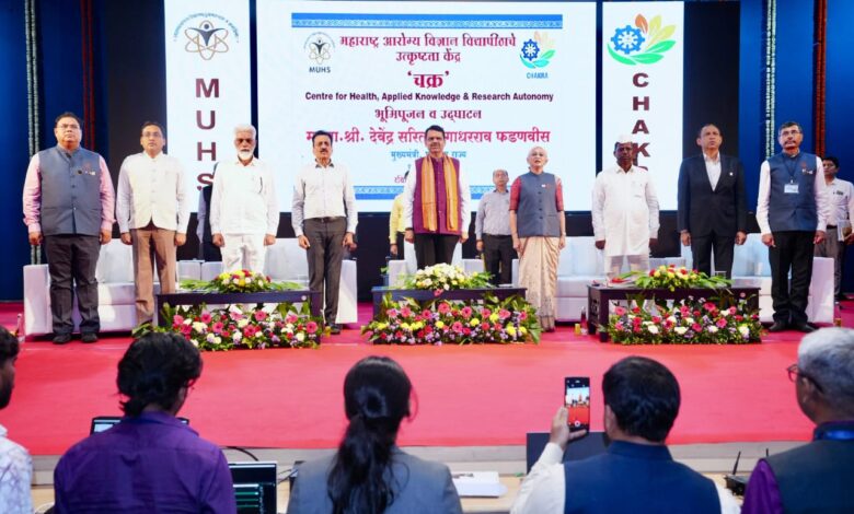 नाशिक : महाराष्ट्रातील आरोग्य शिक्षणाचा केंद्रबिंदू असलेल्या महाराष्ट्र आरोग्य विज्ञान विद्यापीठ, नाशिक येथे ‘उत्कृष्टता केंद्रा’चे भूमिपूजन आणि ‘चक्र’ – सेंटर फॉर हेल्थ, अप्लाइड नॉलेज अँड रिसर्च ऑटोनॉमी या अभिनव संकल्पनेचे उद्घाटन मुख्यमंत्री देवेंद्र फडणवीस यांच्या हस्ते संपन्न झाले.