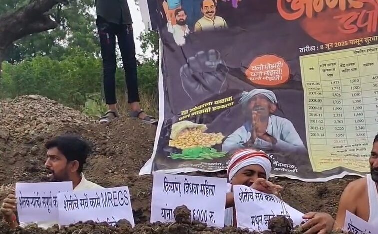 डवरगाव (मोर्शी) येथे प्रहारचे अर्ध दफन आंदोलन – शेतकऱ्यांची कर्जमाफी आणि दिव्यांग हक्कांसाठी सरकारचा तीव्र निषेध