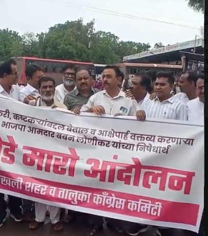 बुलढाणा : भाजपचे माजी मंत्री तथा आमदार बबनराव लोणीकर यांच्या वादग्रस्त वक्तव्याच्या निषेधार्थ चिखली येथे काँग्रेसने जोरदार ‘जोड़े मारो आंदोलन’ छेडले. लोकांच्या अंगावरील कपडे, चप्पल आणि त्यांचा पगार सरकार देते, असे विधान करून लोणीकर यांनी शेतकरी आणि महिला वर्गाचा अवमान केल्याचा आरोप काँग्रेसने केला आहे.