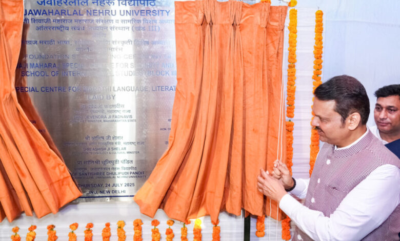 दिल्ली येथील जवाहरलाल नेहरू विद्यापीठातील कन्व्हेन्शन सेंटरमध्ये ‘श्री छत्रपती शिवाजी महाराज सामरिक आणि संरक्षण विशेष अध्यासन केंद्र’ आणि ‘कुसुमाग्रज मराठी भाषा, साहित्य आणि संस्कृती अध्यासन केंद्रा’चे उद्घाटन मुख्यमंत्री देवेंद्र फडणवीस यांच्या हस्ते झाले. याप्रसंगी ते बोलत होते. व्यासपीठावर मराठी भाषा मंत्री डॉ.उदय सामंत, जवाहरलाल नेहरु विद्यापीठाचे कुलगुरु प्रा. शांतिश्री धुलिपुडी पंडित , तंजावर घराण्याचे छत्रपती बाबाजीराजे भोसले, कुलसचिव प्रा. रविकेश उपस्थित होते.