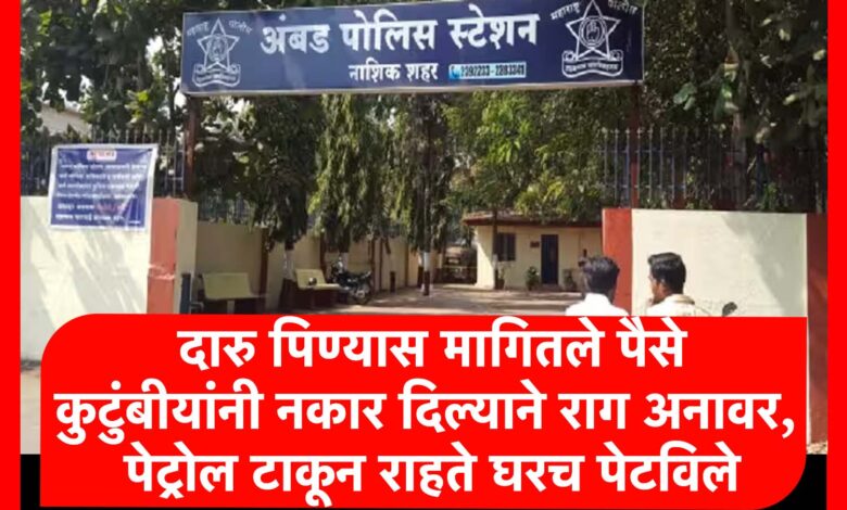 नाशिक येथे दारूचे व्यसन असल्याने रोज दारू पिऊन धिंगाणा घालण्याचा प्रकार सुरु होता. यात दारू पिण्यासाठी पैसे मागितले असता कुटुंबीयांनी पैसे देण्यास नकार दिला. पैसे न दिल्याच्या रागातून राहत्या घरावर पेट्रोल टाकून पेटवून दिल्याचा धक्कादायक प्रकार नाशिकच्या उत्तमनगर परिसरातील भगवती चौकात घडला आहे. या घटनेने खळबळ उडाली आहे.