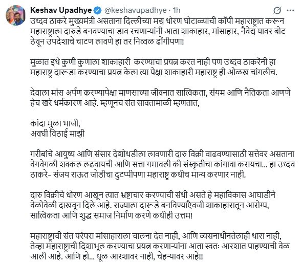 “उध्दव ठाकरे मुख्यमंत्री असताना दिल्लीच्या मद्य धोरण घोटाळ्याची कॉपी महाराष्ट्रात करून महाराष्ट्राला दारुडे बनवण्याचा डाव रचणाऱ्यांनी आता शाकाहार, मांसाहार, नैवेद्य यावर बोट ठेवून उपदेशाचे चाटण लावणे हा तर निव्वळ ढोंगीपणा,” असा टोला भाजपाचे प्रवक्ते केशव उपाध्ये यांनी लगावला आहे. त्यांनी आपल्या एक्स अकाऊंटवरुन ‘सामना’च्या वेबसाईटवरील संजय राऊतांच्या लेखाचा स्क्रीनशॉट शेअर करत हे विधान केलं आहे.