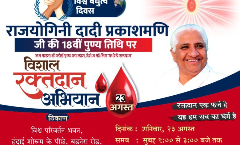 ब्रह्माकुमारीज़ संस्थान की पूर्व मुख्य प्रशासिका राजयोगिनी दादी प्रकाशमणि जी की 18 वीं पुण्यतिथि (25 अगस्त 2025), जिसे विश्व बंधुत्व दिवस के रूप में मनाया जाता है, के उपलक्ष्य में संस्थान द्वारा भारत एवं नेपाल में एक विशाल रक्तदान महाअभियान चलाया जा रहा है। इसका उद्देश्य रक्त की आवश्यकता की पूर्ति करना एवं गिनीज़ वर्ल्ड रिकार्ड बनाना है। इस महाअभियान का राष्ट्रीय शुभारंभ 17 अगस्त को नई दिल्ली में केंद्रीय स्वास्थ्य एवं परिवार कल्याण मंत्री श्री जे.पी. नड्डा द्वारा किया गया। राष्ट्रीय शुभारंभ के उपरांत भारत और नेपाल में रक्तदान शिविरों की शुरुआत की जाएगी। इसके अंतर्गत 22 से 25 अगस्त तक पूरे देश में 1500+ ब्रह्माकुमारी सेवा केन्द्रों पर एक साथ विशाल रक्तदान शिविर आयोजित होंगे। इस अभियान का लक्ष्य 1 लाख (100,000) यूनिट रक्त एकत्रित करना है। राजयोगोनी सीता दीदीजी,सचिव-समाज सेवा प्रभाग,महाराष्ट्र ने बताया कि यह महाअभियान ब्रह्माकुमारीज़ संस्थान द्वारा भारत सरकार के स्वास्थ्य एवं परिवार कल्याण मंत्रालय, जिला ब्लड बैंक, रेडक्रॉस सोसायटी, सरकारी अस्पताल, मेडिकल कॉलेज, रोटरी इंटरनेशनल क्लब, लायंस क्लब, आईएसबीटीआई, डिफेंस फोर्सेज, एन.सी.सी., एन.एस.एस., कॉरपोरेट्स एवं अन्य स्थानीय संस्थाओं के सहयोग से आयोजित किया जा रहा है।
