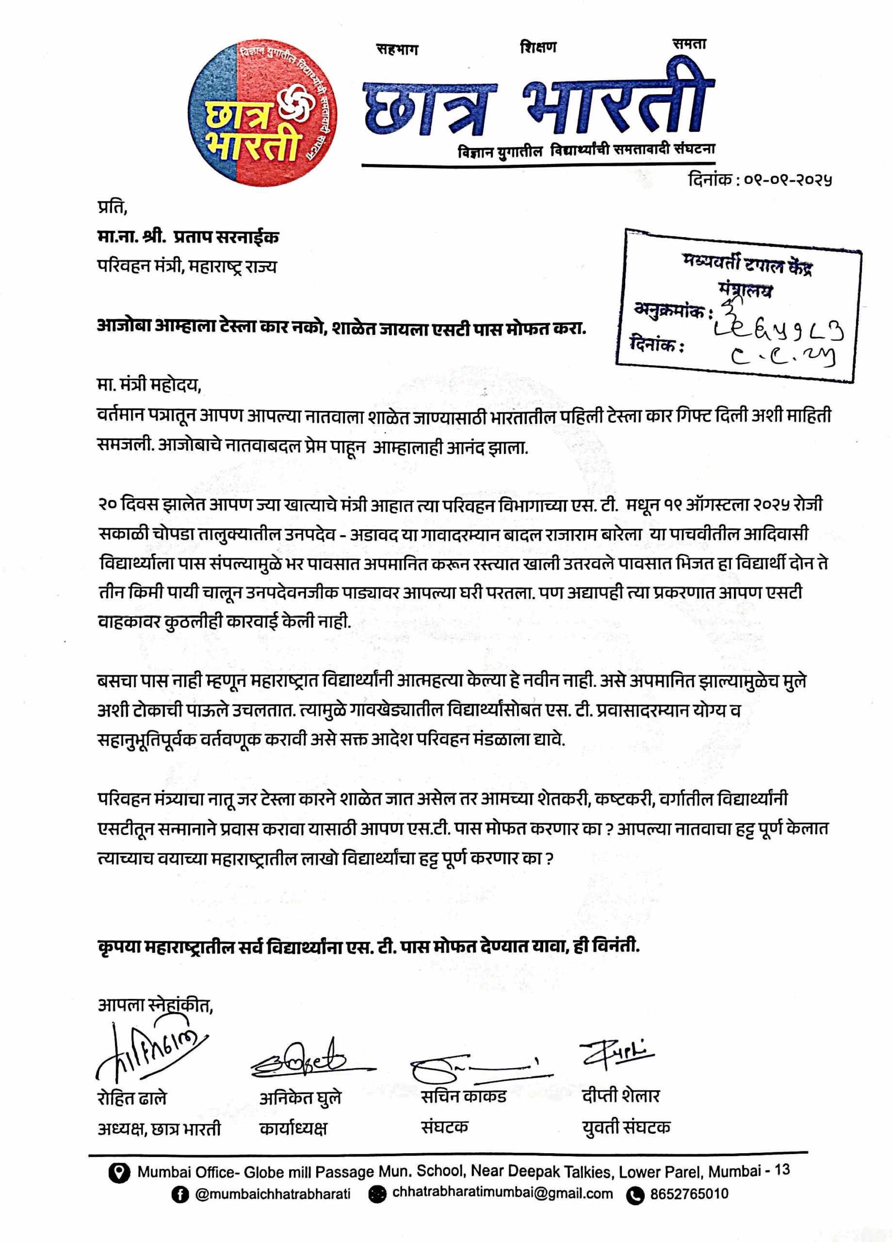 मुंबई : राज्याचे परिवहन मंत्री प्रताप सरनाईक यांनी आपल्या नातवासाठी खास भारतातील पहिली टेस्ला कार विकत घेतल्याच्या बातमीवरून सध्या राज्यात राजकीय आणि सामाजिक स्तरावर चांगलीच चर्चा सुरू आहे. दरम्यान, ग्रामीण आणि आदिवासी भागातील विद्यार्थ्यांच्या वतीने ‘छात्र भारती’ या विद्यार्थी संघटनेने सरनाईक यांना एक भावनिक आणि थेट पत्र लिहित आपली व्यथा मांडली आहे.