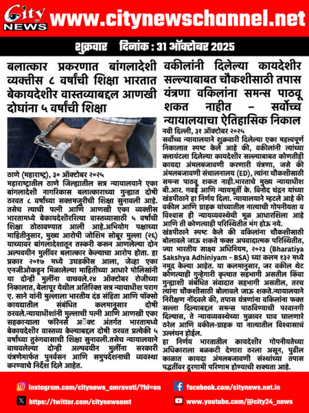 Home/Latest News/बलात्कार प्रकरणात बांगलादेशी व्यक्तीस ८ वर्षांची शिक्षा भारतात बेकायदेशीर वास्तव्याबद्दल आणखी दोघांना ५ वर्षांची शिक्षा Latest News बलात्कार प्रकरणात बांगलादेशी व्यक्तीस ८ वर्षांची शिक्षा भारतात बेकायदेशीर वास्तव्याबद्दल आणखी दोघांना ५ वर्षांची शिक्षा city24 Send an email October 31, 2025 0 Less than a minute Share Facebook X LinkedIn WhatsApp Share via Email Post Views: 16 TagsLatest News city24 Send an email October 31, 2025 0 Less than a minute Share Facebook X LinkedIn WhatsApp Share via Email Show More Share Facebook X LinkedIn Pinterest WhatsApp Share via Email