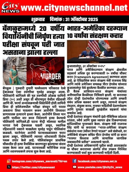 Home/Crime News/बेंगळुरूमध्ये २० वर्षीय विद्यार्थिनीची निर्घृण हत्या परीक्षा संपवून घरी जात असताना झाला हल्ला Crime NewsLatest News बेंगळुरूमध्ये २० वर्षीय विद्यार्थिनीची निर्घृण हत्या परीक्षा संपवून घरी जात असताना झाला हल्ला city24 Send an email October 31, 2025 4 Less than a minute Share Facebook X LinkedIn WhatsApp Share via Email Post Views: 15 TagsLatest News city24 Send an email October 31, 2025 4 Less than a minute Share Facebook X LinkedIn WhatsApp Share via Email Show More Share Facebook X LinkedIn Pinterest WhatsApp Share via Email