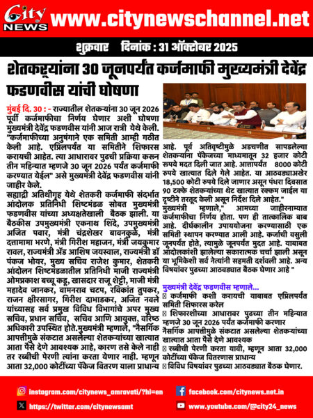 Home/Maharashtra/शेतकऱ्यांना 30 जूनपर्यंत कर्जमाफी मुख्यमंत्री देवेंद्र फडणवीस यांची घोषणा Maharashtra शेतकऱ्यांना 30 जूनपर्यंत कर्जमाफी मुख्यमंत्री देवेंद्र फडणवीस यांची घोषणा city24 Send an email October 31, 2025 8 Less than a minute Share Facebook X LinkedIn WhatsApp Share via Email Post Views: 15 TagsLatest News maharashtra city24 Send an email October 31, 2025 8 Less than a minute Share Facebook X LinkedIn WhatsApp Share via Email Show More Share Facebook X LinkedIn Pinterest WhatsApp Share via Email