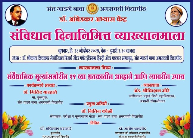 संत गाडगे बाबा अमरावती विद्यापीठात डॉ. आंबेडकर अभ्यास केंद्राच्यावतीने दि. 26 नोव्हेंबर, 2025 रोजी संविधान दिनानिमित्त दुपारी 3.30 वाजता विद्यापीठ परिसरातील डॉ. श्रीकांत जिचकार स्मृति संशोधन केंद्र सभागृहामध्ये व्याख्यानमालेचे आयोजन करण्यात आले आहे. ‘संवैधानिक मूल्यांसमोरील 21 व्या शतकातील आव्हाने आणि त्यावरील उपाय’ या विषयावर छत्रपती संभाजीनगर येथील माणिकचंद पहाडे विधी महाविद्यालयाचे अॅड. श्रीकिशन मोरे हे व्याख्यान देणार आहेत. विचारपीठावर अध्यक्षस्थानी कुलगुरू डॉ. मिलींद बारहाते, प्रमुख अतिथी म्हणून विद्यापीठाच्या परीक्षा व मूल्यमापन मंडळाचे संचालक डॉ. नितीन कोळी उपस्थित राहणार आहेत.