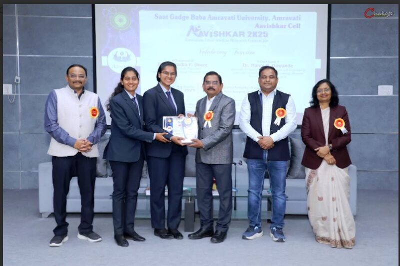 अमरावती (दि. 02.01.2026)- संत गाडगे बाबा अमरवती विद्यापीठात नुकत्याच पार पडलेल्या विद्यापीठस्तरीय आविष्कार स्पर्धेत मास्टर ऑफ बिझनेस अॅडमिनिस्ट्रेशन (एम.बी.ए.) विभागाच्या विद्यार्थीनी कु. समिक्षा घाटोळ व कु. पल्लवी वानखडे यांच्या ‘इन्नोव्हेशन : हिडन व्हॅल्यू ऑफ विड’ या प्रकल्पाला कलर कोट पुरस्कार मिळाला आहे. प्र-कुलगुरू डॉ. महेंद्र ढोरे यांच्या हस्ते सदर विद्यार्थीनींना पुरस्काराने गौरविण्यात आले.