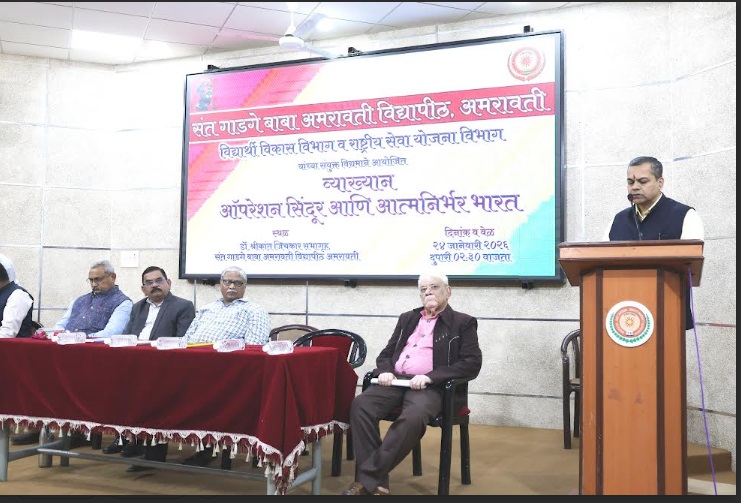 अमरावती (दि. 25.01.2026)- 1965 च्या युध्दात भारताला विजय मिळाला असला तरी शस्त्रास्त्र तंत्रज्ञान भारताला विदेशाचे घ्यावे लागले होते, मात्र आता भारत संरक्षण क्षेत्रात आत्मनिर्भर होत असून स्वदेशी बनावटीचे शस्त्रास्त्र भारत निर्माण करीत आहे. त्यामुळेच भारताला ऑपरेशन सिंदुरमध्ये यश मिळाले, असे प्रतिपादन पुणे येथील डीआरडीओ चे सेवानिवृत्त समूह संचालक श्री काशीनाथ देवधर यांनी केले. 77 व्या प्रजासत्ताक दिनाचे औचित्य साधून विद्यार्थी विकास आणि राष्ट्रीय सेवा योजना विभागाच्या संयुक्त विद्यमाने विद्यापीठ परिसरातील डॉ. श्रीकांत जिचकार स्मृती संशोधन केंद्र सभागृहात आयोजित ‘ऑपरेशन सिंदूर आणि आत्मनिर्भर भारत’ या विषयावर व्याख्यान देतांना ते बोलत होते. विचारमंचावर अध्यक्षस्थानी कुलगुरू डॉ. मिलींद बारहाते, प्र-कुलगुरू डॉ. महेंद्र ढोरे, पुणे येथील माजी प्राचार्य तथा नॅक मूल्यांकन समितीचे माजी सदस्य डॉ. नागनाथ धर्माधिकारी, विद्यापीठ व्यवस्थापन परिषद सदस्य डॉ. रविंद्र कडू, विद्यार्थी विकास संचालक डॉ. राजीव बोरकर उपस्थित होते.