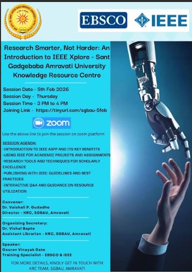 ज्ञानस्त्रोत केंद्राव्दारे दरवर्षी विद्यार्थी, वाचक आणि संशोधकांकरिता काही ऑनलाईन डाटाबेसेसची वर्गणी जमा केल्या जाते. विद्यापीठास वन नेशन वन सब्सक्रिप्शन योजनेंतर्गत 30 डाटाबेसेसचा अॅक्सेस मिळाला असून यामध्ये आयईईई एक्स्प्लोर याही डाटाबेसेसचा समावेश आहे. अभियांत्रिकी व तंत्रज्ञान या विषयातील संशोधन प्रलेखांसोबत यामध्ये इतर आंतरशाखीय विषयाचे साहित्य देखील उपलब्ध आहे. सदर डाटाबेसेसचा संशोधनाकरिता महत्तम उपयोग व्हावा, याकरिता या माहिती साक्षरता वर्गाचे आयोजन करण्यात आले आहे. यामध्ये आयईईई एक्स्प्लोर या डाबेसेसेसच्या सहाय्याने संशोधनास आवश्यक माहिती कशी शोधायची, त्याचा संशोधनात उपयोग कसा करायचा याचे प्रशिक्षण सदर माहिती साक्षरता वर्गामध्ये देण्यात येणार आहे. वेबिनारचा विषय रिसर्च स्मार्टर, नॉट हार्डर : अॅन इन्ट्रोडक्शन टू आयईईई एक्ल्प्लोर असा असून सदर प्रशिक्षण अभियांत्रिकी व तंत्रज्ञान क्षेत्रातील तसेच इतर शाखेच्या संशोधकांना अतिशय उपयोगी होणार असून सर्व शिक्षक, विद्यार्थी, वाचक आणि संशोधकांनी https://tinyurl.com/sgbau-5feb या लिंकवर क्लीक करून सदर प्रशिक्षणाचा लाभ घ्यावा, असे आवाहन करण्यात येत आहे.