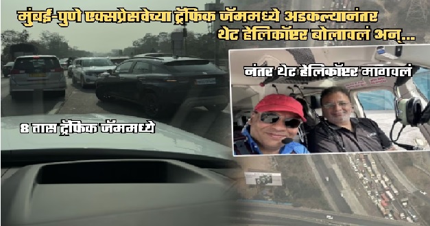 लोणावळा/पुणे: मुंबई-पुणे एक्सप्रेसवेवर मंगळवारपासून झालेला ३२ तासांचा महाभयंकर ट्रॅफिक जॅम सध्या चर्चेचा विषय ठरला आहे. हजारो लोक अन् शेकडो गाड्या रस्त्यावर अडकून पडल्या होत्या. मात्र, याच कोंडीत अडकलेल्या एका बड्या उद्योगपतीने जे केलं, त्याची आता सोशल मीडियावर जोरदार चर्चा सुरू आहे. तब्बल ८ तास ट्रॅफिकमध्ये अडकल्यानंतर या उद्योगपतीने चक्क हेलिकॉप्टर बोलावून आपली सुटका करून घेतली.